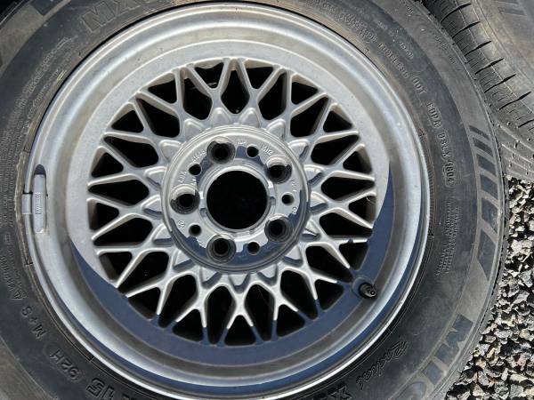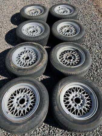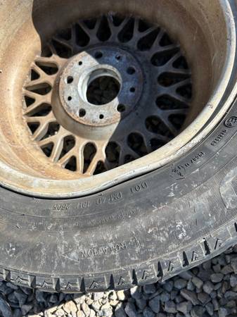 BMW 8 wheels, style 5, 1179774 15” Hub caps 8. From early to mid 1990 5 series E34, will fit 1980’s e28, 528e, 535i, 535is. Tires are no good, well worn and old. One wheel has inside bend. As is....